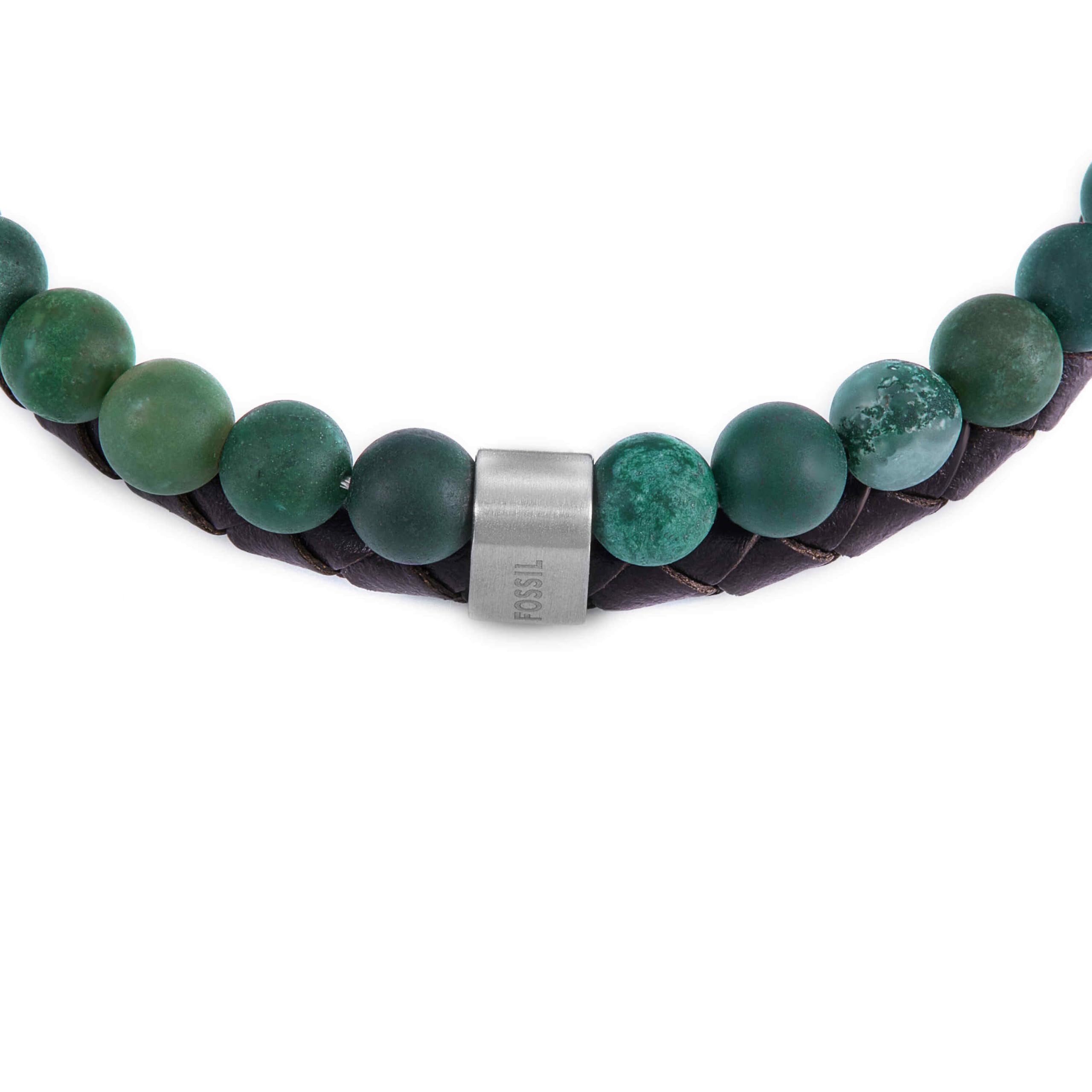 - Introducing our bold multi-strand bracelet: brown leather meets green glass beads. Masculine yet modern, this layered design features sleek silver beads juxtaposed against rich brown leather. The fold-over clasp lends a rugged, utilitarian edge.