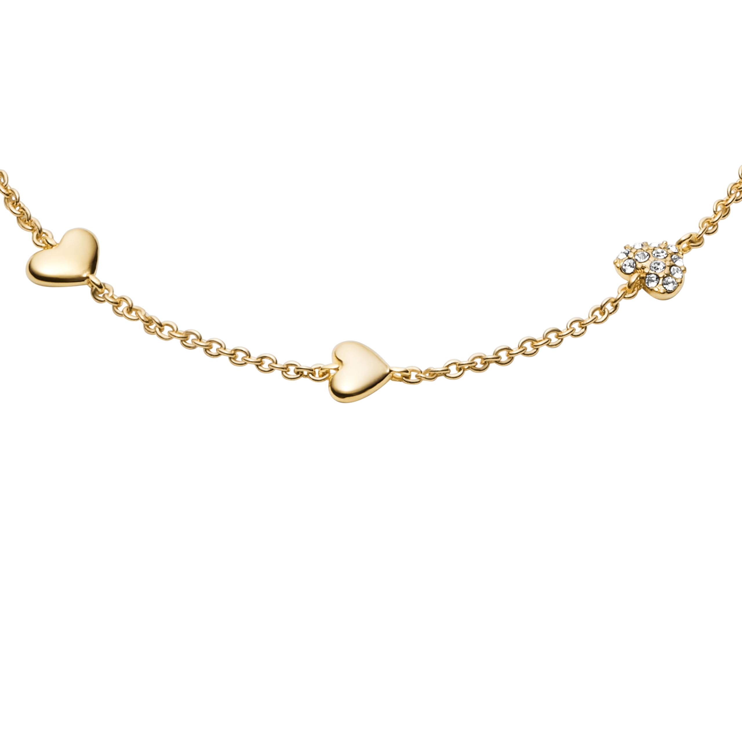 - Heart-shaped stations in metal and delicate pavé crystal accents repeat along the gold-tone brass chain. The polished finish enhances its sleek design, and the lobster clasp provides a secure and adjustable fit.